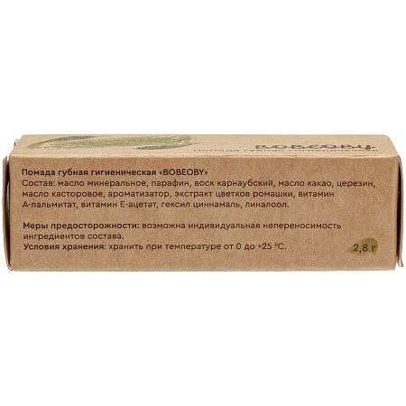 Состав: масло минеральное, парафин, воск карнаубский, масло какао, церезин, масло касторовое, ароматизатор, экстракт цветков ромашки, витамин А-пальмитат, витамин Е-ацетат.