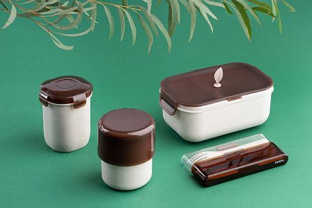 ланчбоксы, приборы - растительные волокна; мешок - пластик, полиэстер; пластик, полипропилен