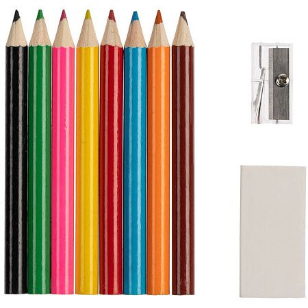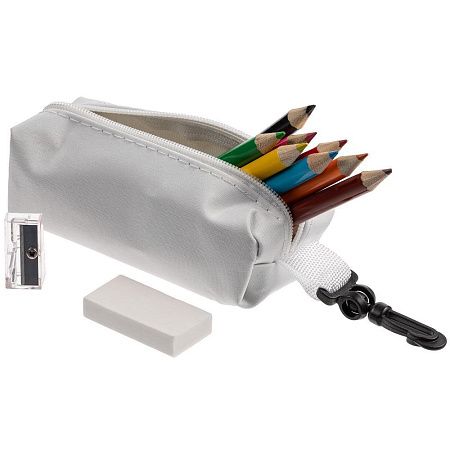 пенал - полиэстер, пластик; карандаши - дерево; точилка - пластик, металл