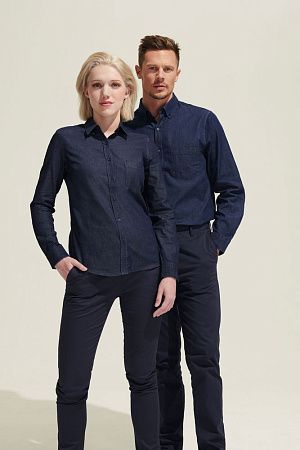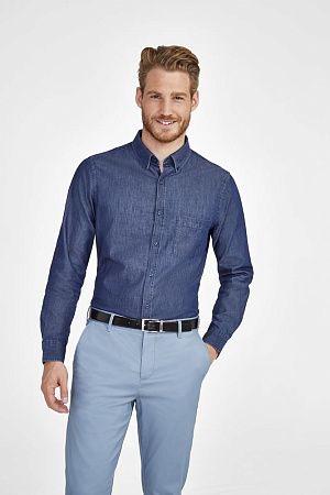 Модель классического кроя из денима с воротником на пуговицах, планкой на 7 пуговиц в тон и манжетами на 1 пуговице.