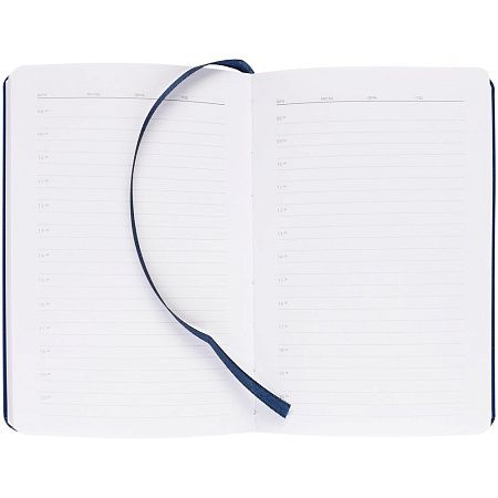 Ежедневник с твердой обложкой, выполнен из материала Latte, темно-синий ХХ, дополнен ляссе в цвет обложки.