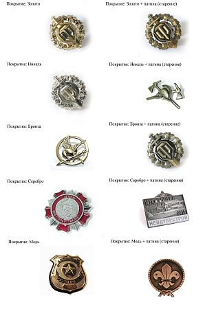 – цвет значка золото/ античное золото / серебро / античное серебро / медь / античная медь / бронза / античная бронза / никель / античный никель / комбинированные цвета – см. фото;