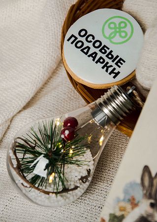Мы собрали самые тёплые новогодние пожелания и создали набор «Лесная сказка». Внутри световой шар, травяной чай, имбирное печенье и вязаные носки.