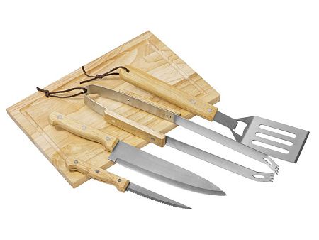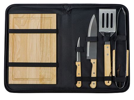 разделочная доска 20 х 30 см, щипцы 34,5 см, лопатка 32,5 см, нож для стейка 21,5 см, нож большой 31,5 см, чехол из полиэстера 38,5 х 4,5 х 24,8 см