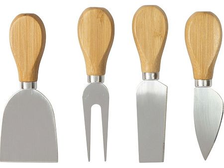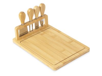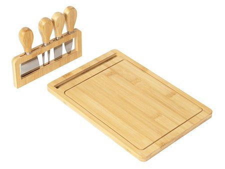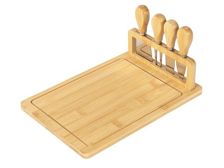 вилка для сыра 12,6 см, нож листовидный 11,9 см, нож-лопатка 12,2 см, нож-топорик 12,4 см, подставка 17,1 х 7 х 1,2 см, доска 28,4 х 19,3 х 1,2