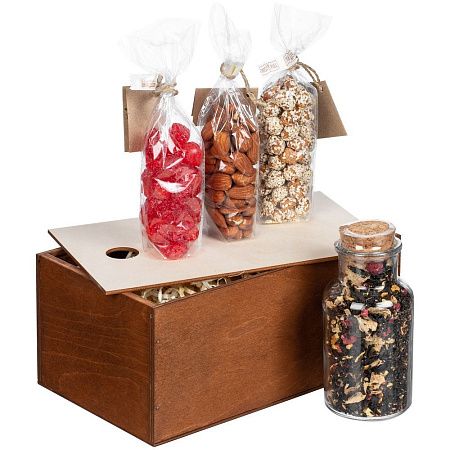чай - стекло, пробка; ящик, наполнитель - дерево; арахис, вишня, миндаль - полиэтилен