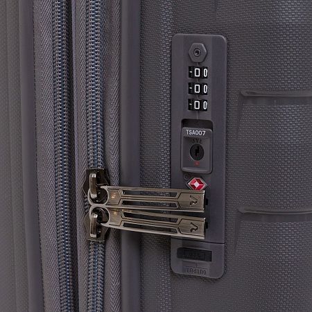 - Чемодан с 2 отделениями: одно из них с фиксирующими ремнями и сетчатой шторкой на молнии, второе — с разделителем на молнии