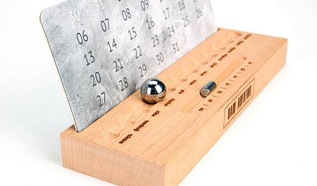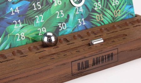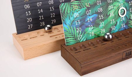 Деревянная подставка изготавливается из дерева светлого или темного цвета. Шариком выставляется месяц, горизонтальным бегунком день недели, а даты выставляются магнитным курсором. Большая площадь под ваш логотип, удобен в использовании, занимает мало места на столе. Календарный блок вы можете выбрать из готовых или заказать со своим индивидуальным дизайном.