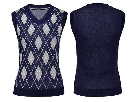 Модель: жилет жаккардовой вязки, плотный и теплый, 2–3 цвета нитей, гладкая поверхность. На бейках горловины и проймы возможна отделка в виде контрастных полос (не более 3-х цветов).