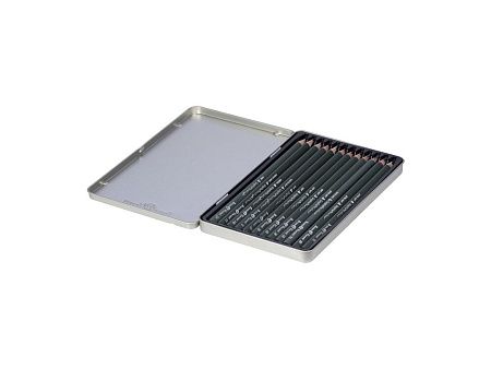 12 карандашей разной твердости (2h, h, hb, b, 2b, 3b, 4b, 5b, 6b, 7b, 8b, 9b), металлическая коробка