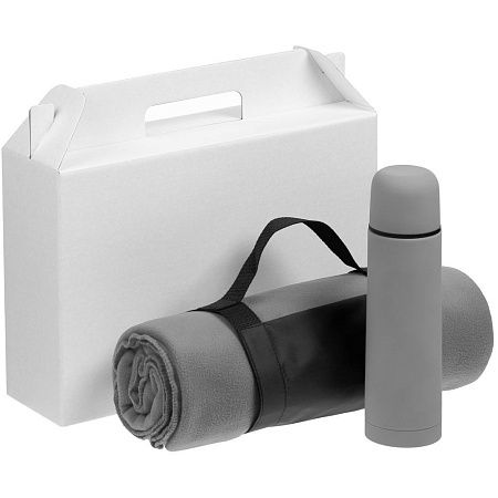 плед - флис, плотность 180 г/м²; термос - нержавеющая сталь, 304 внутри, 201 снаружи, пластик, покрытие софт-тач; коробка - микрогофрокартон