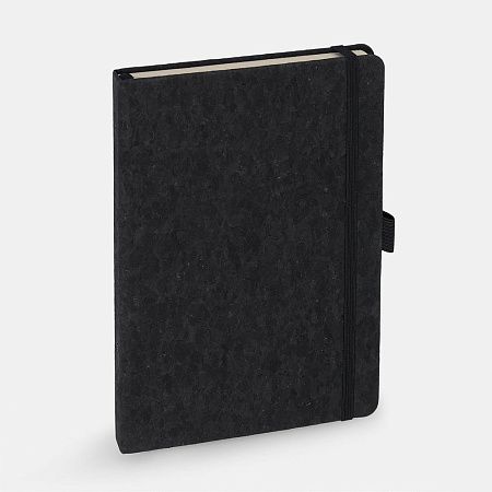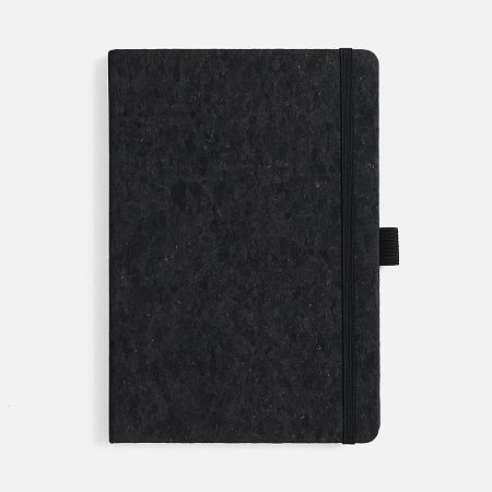 Блокнот с твердой обложкой из натуральной окрашенной пробки, дополнен петлей-резинкой для ручки, ляссе и резинкой в цвет обложки.