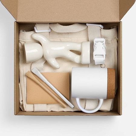 рюкзак - хлопок, плотность 280 г/м²; набор для выращивания funky buddy - керамика; кружка - каменная керамика, подставка - пробка; коробка - микрогофрокартон, Т-23Е; лента - нейлон, пластик; металл; блокнот, ручка - картон