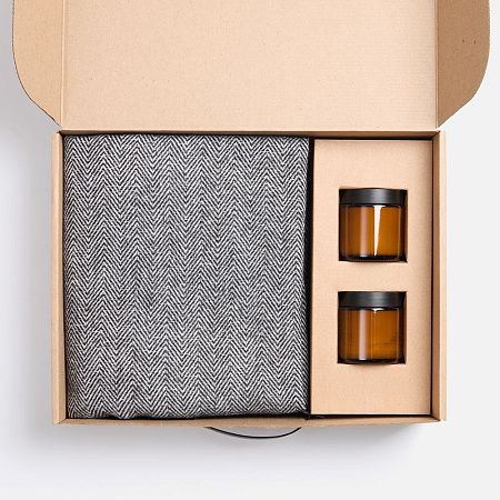 плед - шерсть, 15%; хлопок, 5%; полиэстер, 60%; акрил, 20%, плотность 200 г/м²; подсвечник - стекло, крышка - пластик; свеча - парафин, соевый воск, парфюмерная композиция; коробка - микрогофрокартон, Т-23Е