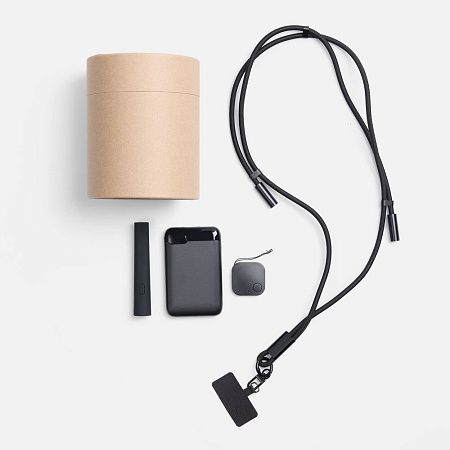 аккумулятор, трекер - пластик; оплетка - нейлон, металл; фонарик - АБС-пластик, покрытие софт-тач; тубус - картон