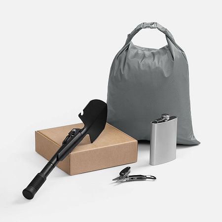 лопата - сталь, пластик; резина; чехол - полиэстер; мультитул - нержавеющая сталь, алюминий; мешок - нейлон, рипстоп; полиуретан; фляжка - нержавеющая сталь, aisi 304; коробка - микрогофрокартон; наполнитель - бумага