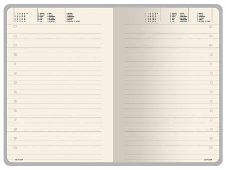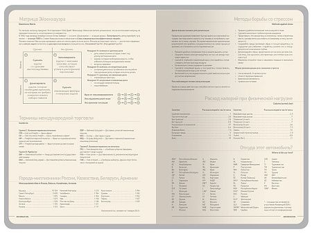 Недатированные страницы в серую линейку имеют отдельное место для проставления числа месяца и дня недели. Справочный блок на 17 страницах содержит полезную информацию из различных областей.