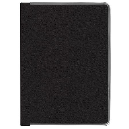 Ежедневник с твердой обложкой и серебристым обрезом, выполнен из материала Saffian, черный, дополнен серым ляссе и металлическими рамками.