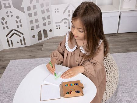 В комплекте 11 цветных восковых мелков и блокнот на 40 страниц для раскрашивания и рисования: 12 страниц с рисунками и 28 чистых страниц. Блокнот и мелки компактно хранятся под одной обложкой.