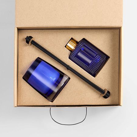 флакон, подсвечник - стекло, палочки из файбера; свеча - воск; коробка - микрогофрокартон