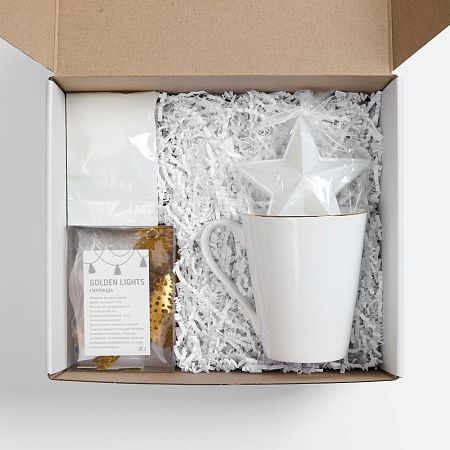 кружка - костяной фарфор; гирлянда - пластик, металл; свеча - парафин; ежедневник - искусственная кожа; ручка - металл