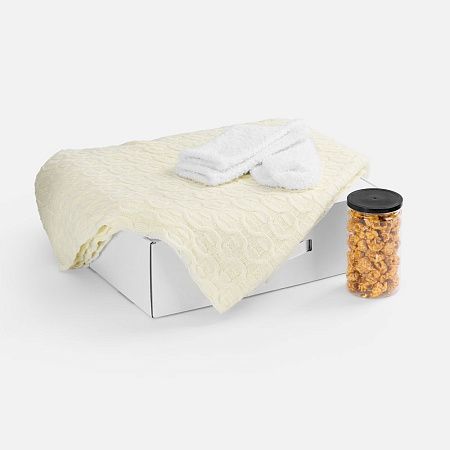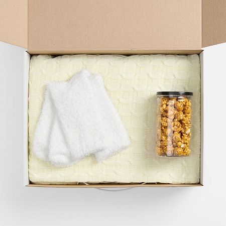 коробка - микрогофрокартон, пластик; плед - акрил 100%; упаковка попкорна - пластик; носки - полиэстер 100%