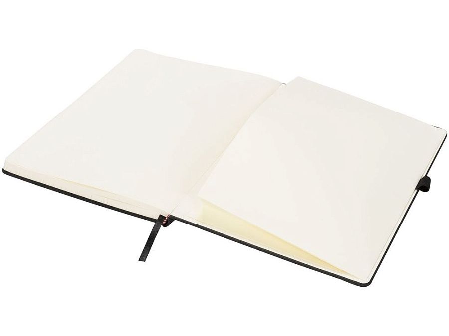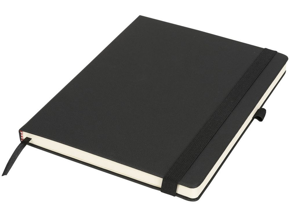 Блокнот Rivista среднего размера. Блокнот Rivista отличается стильным современным дизайном с высококачественной обложкой, идеально подходящей для нанесения логотипа и информации вашей компании. Предлагаются современные цвета. Также предусмотрена эластичная застежка, держатель для ручки, лента-закладка и внутренний кармашек на задней стороне обложки. Содержит 128 листов линованной бумаги (70 г/м²) кремового цвета. ПУ.