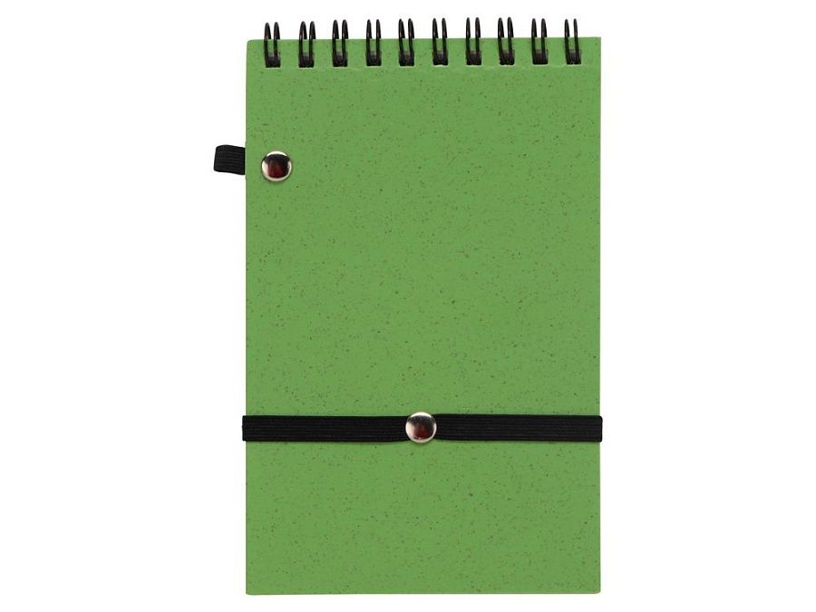 Блокнот с обложкой из переработанной пшеницы и пластика. Блок состоит из 60 листов переработанной бумаги белого цвета. Крепление - пружина. Дополнен петлей для ручки и горизонтальной резинкой.