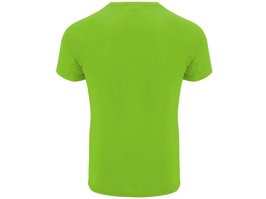 Спортивная футболка с коротким рукавом реглан. Круглый вырез горловины с отделкой плоским швом. Рукав сложного кроя для обеспечения дополнительного удобства при занятиях спортом. Отделка плоским швом с застилом по пройме и рукавам.