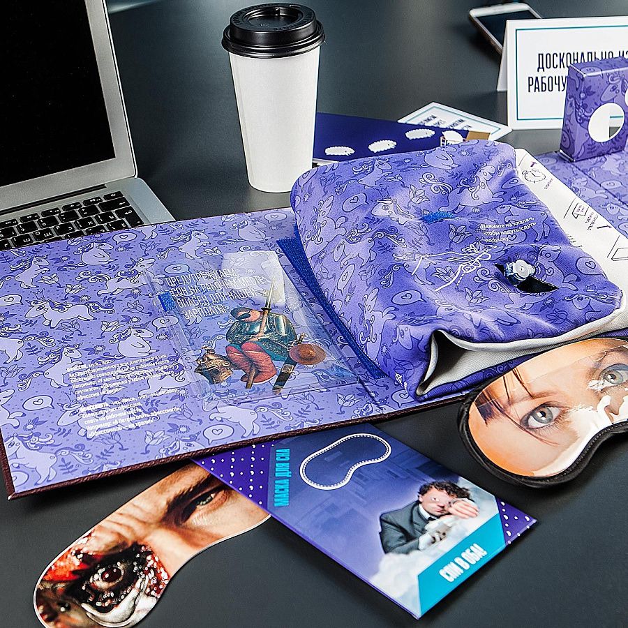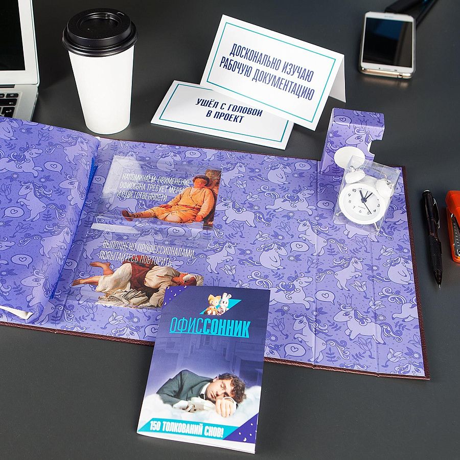 Набор для людей, знакомых с офисной жизнью и обладающих хорошим чувством юмора. Уникальный подарок, который поможет незаметно вздремнуть посреди рабочего дня. Просто откройте этот набор, маскирующийся под огромный фолиант, и вы найдёте всё необходимое, чтобы устроить на рабочем месте незаметное «сонное царство». Необычная концепция, качественный дизайн, лёгкая креативная подача набора, а также множество шуток заряжают позитивом и позволяют немного отвлечься от офисной рутины.
