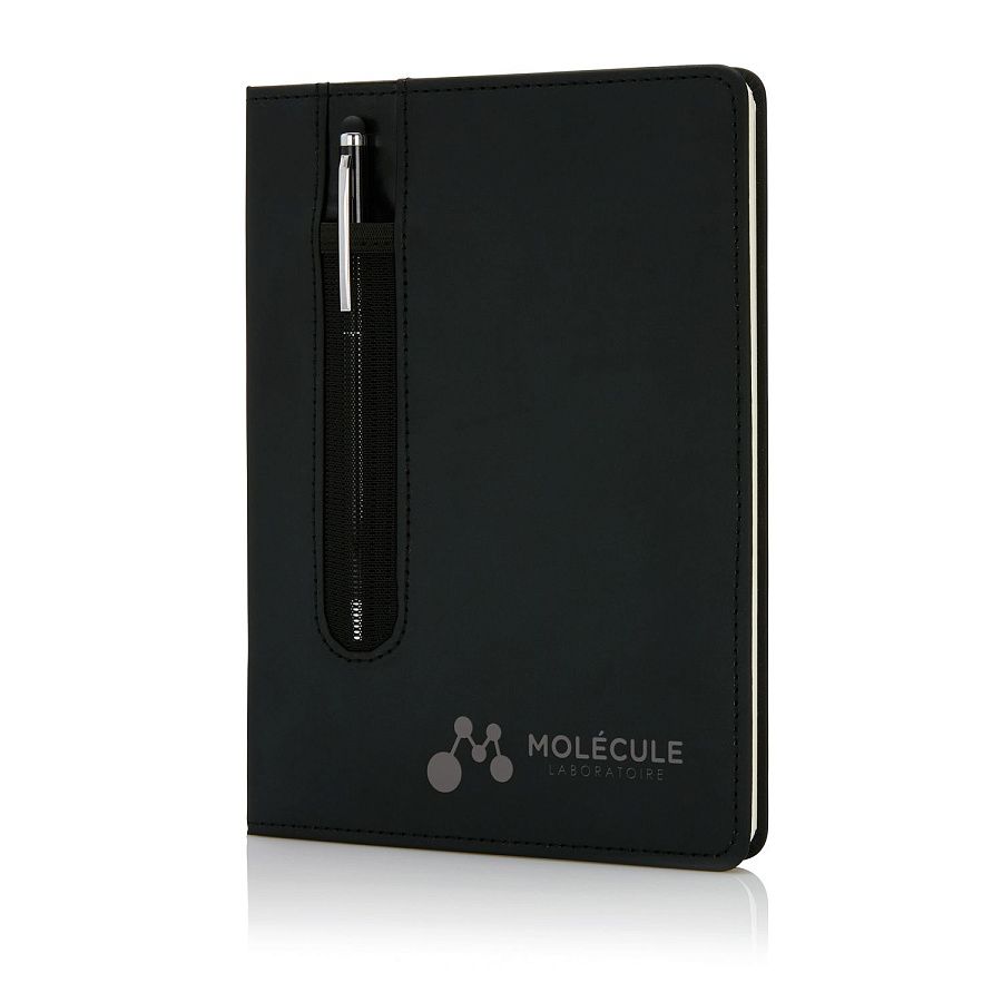Блокнот для записей Deluxe формата A5 с кармашком для ручки и ручкой-стилус в комплекте. Упакован в подарочную коробку. Блок формата А5 на 80 страниц, плотность бумаги 80 г/м2.