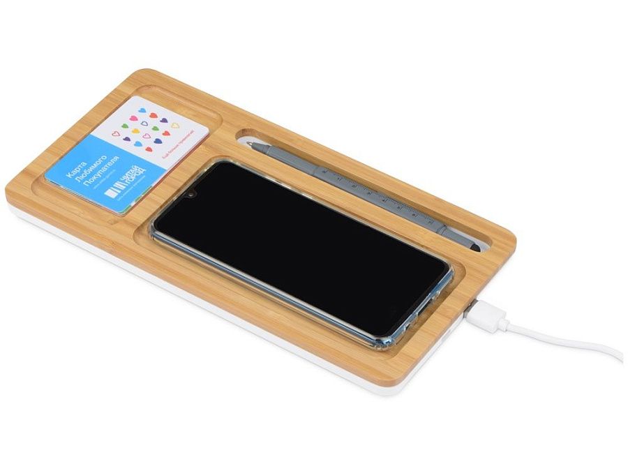 Органайзер Timber с функцией беспроводной зарядки — современный и стильный бизнес-подарок для поклонников экодизайна. Подойдет для хранения смартфона, ручки и визитных или клубных карт. Лаконичный дизайн с выраженной текстурой бамбука позволяет аксессуару гармонично вписаться практически в любой интерьер. В комплект входит кабель USB-C. Дополнительный плюс — выходной разъем USB.