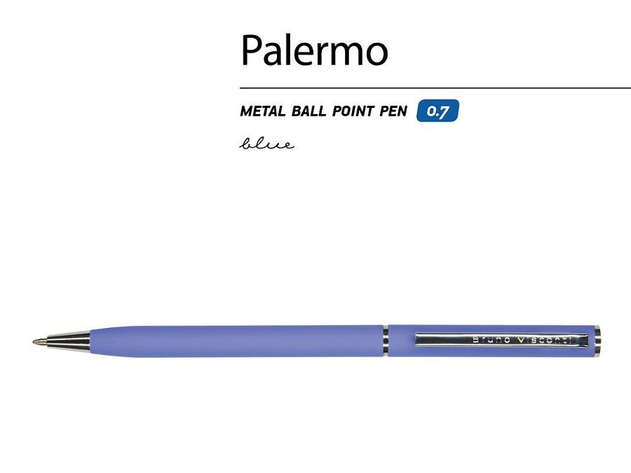 Автоматическая металлическая ручка "Bruno Visconti" серии "Palermo" однотонного цвета порадует любителей всего изящного и утонченного. Покрытие корпуса Soft Touch гарантирует дополнительный комфорт в работе с ней. Стержень легко выдвигается благодаря поворотному механизму. Синие пигментные чернила Dokumental (Германия) и пишущий узел Premec (Швейцария) обеспечивают качественное и мягкое письмо.