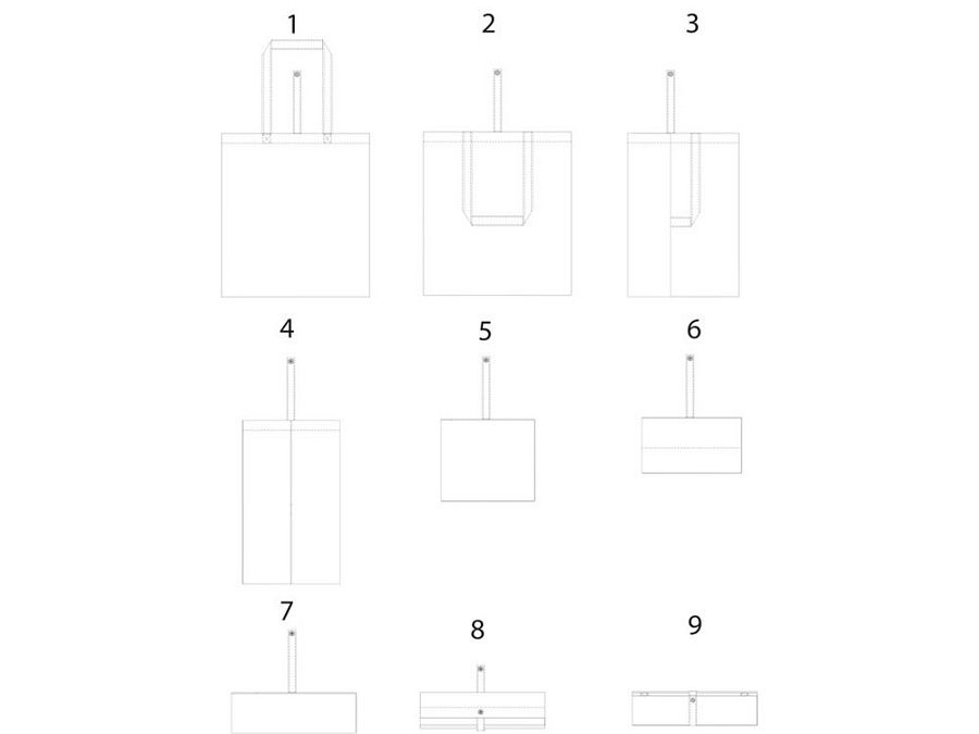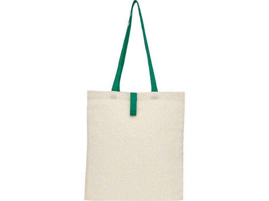 Эко-сумка с открытым основным отделением и цветными ручками, раскладывающаяся в высоту на 32 см. Имеет ремень с пуговичной застежкой, чтобы закрывать сумку. Прочность до 8 кг.