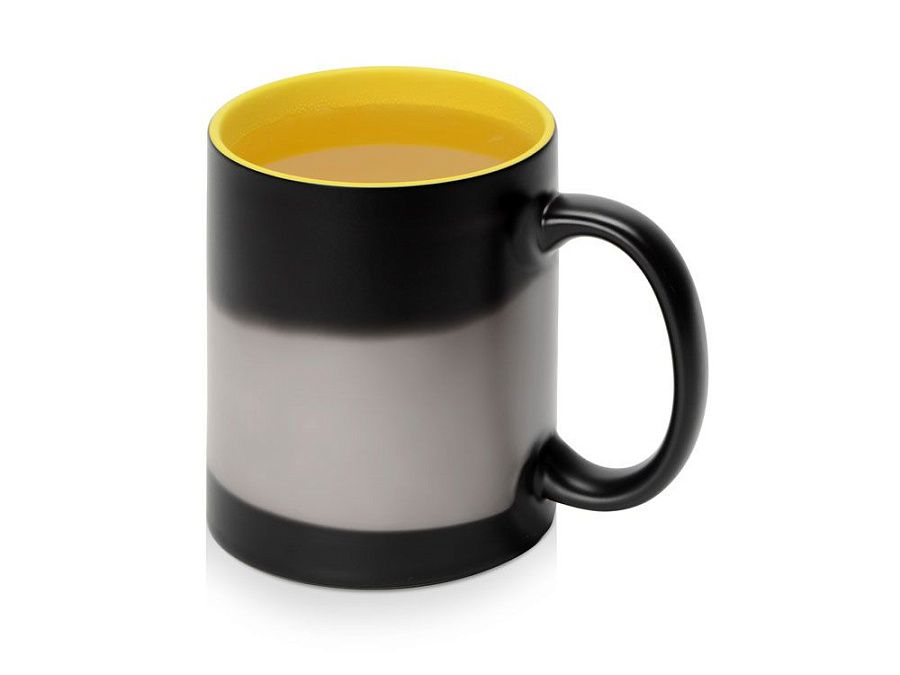 Кружка-хамелеон меняет свой облик, едва вы нальете в нее горячий напиток: черная поверхность постепенно изменяет свой цвет, становясь белой. Внутренняя часть кружки — яркая, цветная, что можно красиво обыграть, удачно сочетая ее с цветом вашего лого или гаммой изображения.