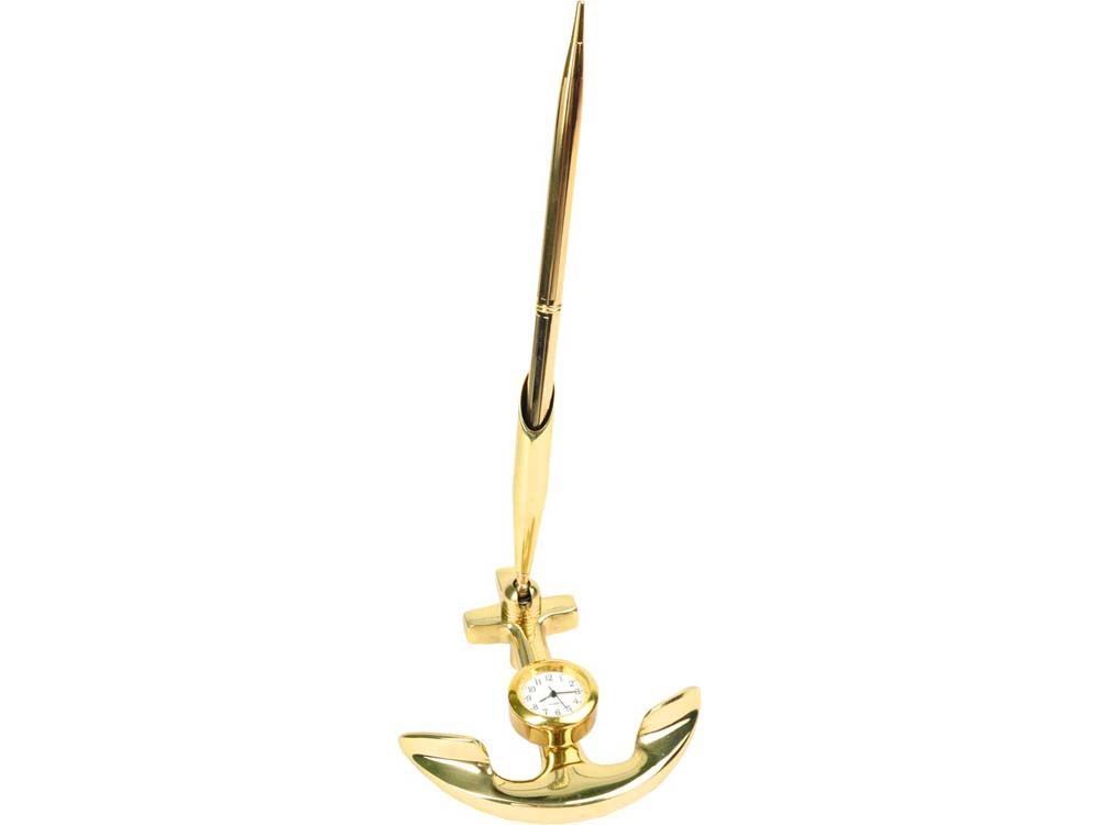 Небольшой настольный прибор в форме якоря оборудован подставкой для ручки и часами. Прибор сделан из латуни и обладает стильной золотистой расцветкой. Прибор идеально подойдет в качестве подарка представителям судоходных компаний, а также любителям рыбалки и моря.