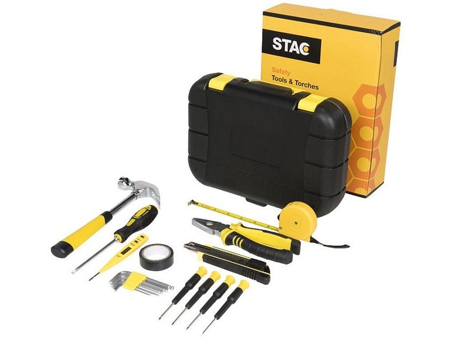 Инструментальный ящик с замком и складной ручкой, включающий молоток-гвоздодер, отвертку с плоским шлицем 4 мм, универсальные плоскогубцы, универсальный нож с фиксатором, 5 шестигранных ключей (2-6 мм) с держателем со стандартными и шаровыми наконечниками, измерительную рулетку длиной 3 м с фиксатором, индикаторную отвертку, изоляционную ленту и 4 прецизионных отвертки. Пластик ABS.