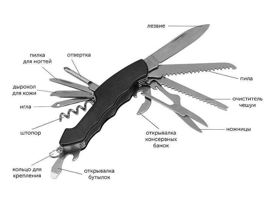фонарик d2,4 х 9 см, компас d4,3 х 0,9 см, нож-мультитул 9,7 х 2,6 см (в сложенном виде) |