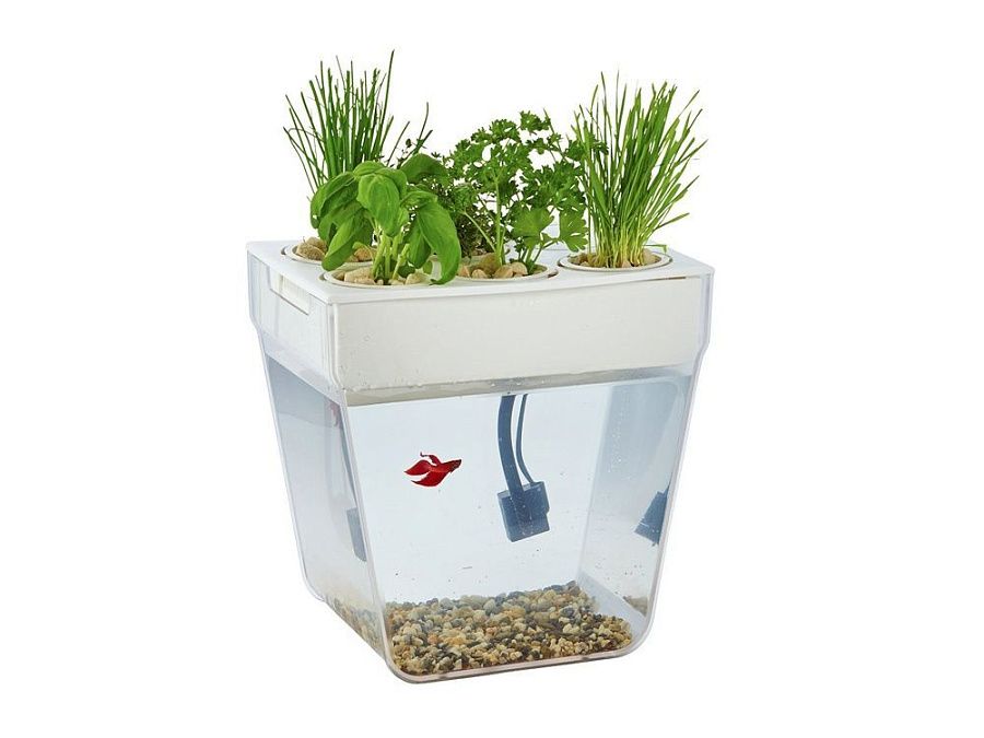 По сути — это замкнутая экосистема, поддерживающая баланс между растениями и рыбкой. Её отходы с помощью насоса поднимаются к горшочкам сверху и питают вашу маленькую плантацию. Взамен рыбка получает очищенную воду, а у любого городского жителя всегда есть в наличии свежая зелень к столу.