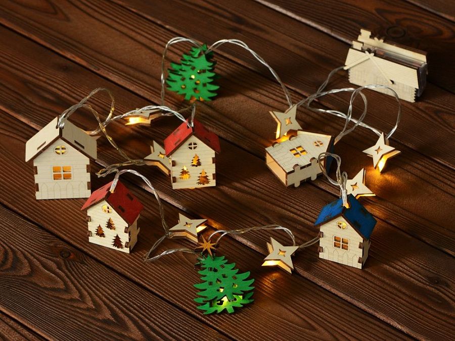 Светодиодная новогодняя елочная гирлянда постоянного свечения с цветными фигурками из натуральной березовой фанеры. Работает от 2-х батареек АА (в комплекте).
