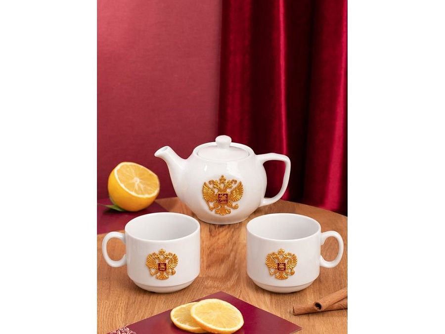 Фарфоровый чайник и две фарфоровые чайные кружки с чеканным металлическим декором «Двуглавый орел». Накладка изготовлена из алюминия методом чеканки с декоративной отделкой «под золото».