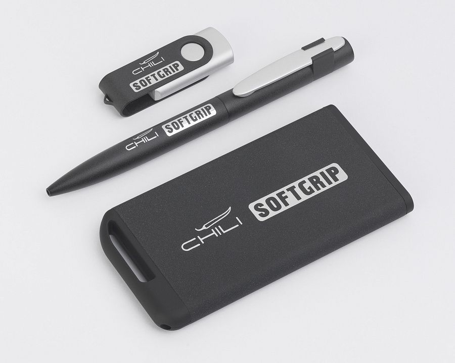 Оригинальное сочетание черного корпуса ручки в покрытии SOFTGRIP, обеспечивающем лёгкий массажный эффект, c цветным металлическим матовым клипом.