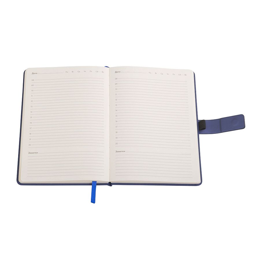 На лицевой стороне ежедневника предусмотрен карман для карт, записок, визиток. Чтобы заметки и записи были под контролем, а пользователь в любой момент мог внести новую информацию - у "Монти" предусмотрена петелька для ручки. Кроме того, ежедневник закрывается на магнитный хлястик.