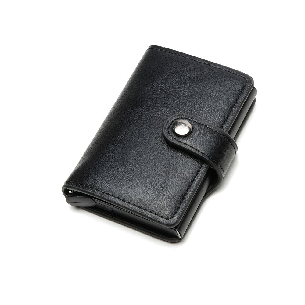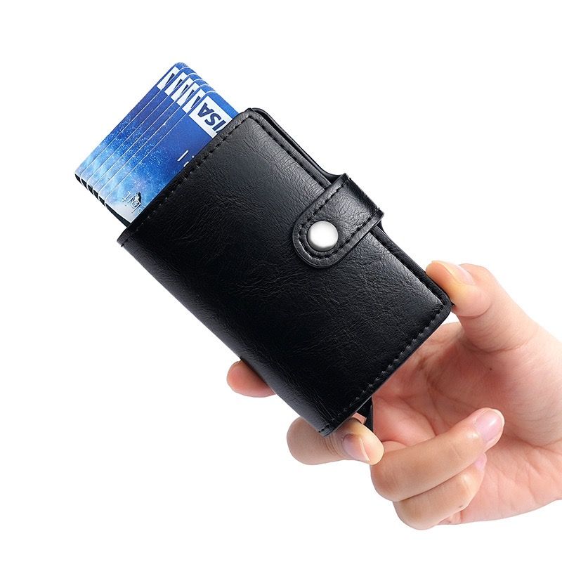 Солидный практичный держатель для банковских карт Bakara с покрытием из экокожи книжного типа и возможностью закрывать, а также функцией RFID, чтобы защитить карты он несанкционированного копирования. Имеет нижнюю кнопку для быстрого извлечения карт.