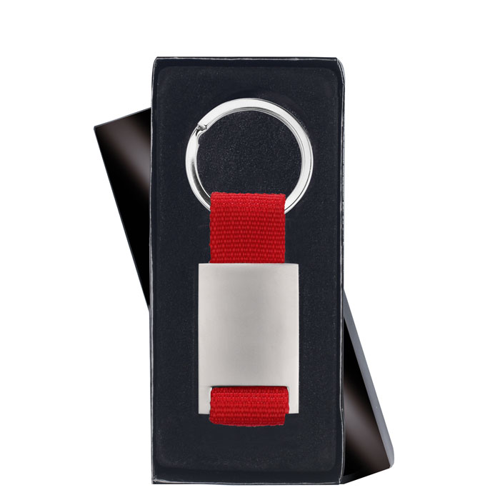 Металлический прямоугольный брелок на ремешке из цветной ткани