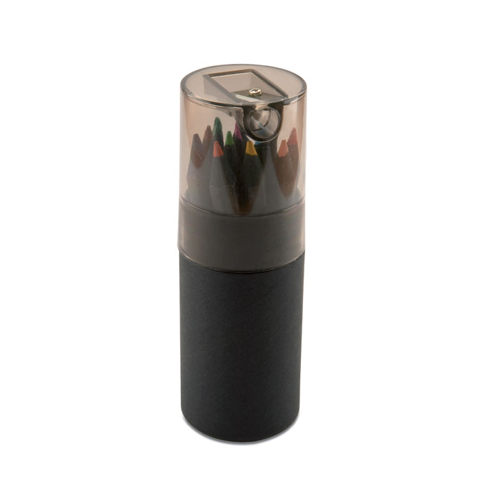 Черный картонный тубус с 12 цветными карандашами и точилкой в крышке тубуса.