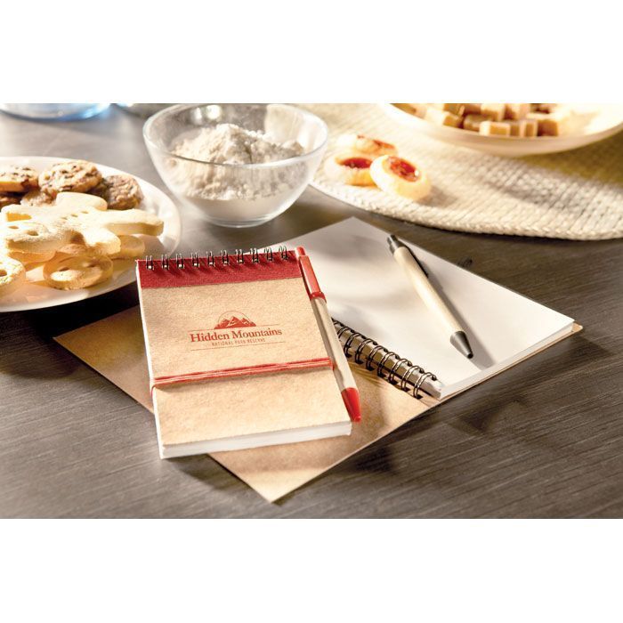 Карманный блокнотик с ручкой. Блок 70 стр. из вторично переработанной бумаги. Застегивается на резинке. Синие чернила.