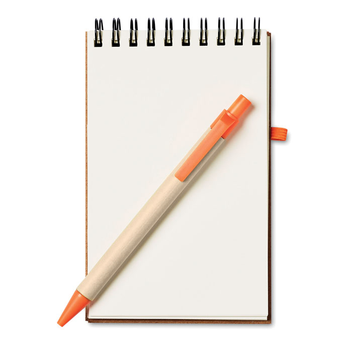 Карманный блокнотик с ручкой. Блок 70 стр. из вторично переработанной бумаги. Застегивается на резинке. Синие чернила.