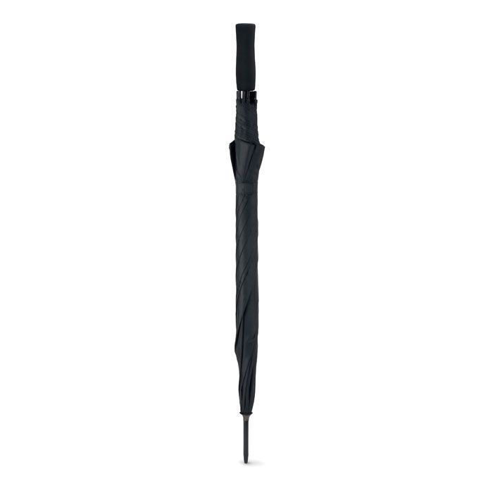 Зонт полуавтомат устойчивый к ветру с черным металлическим стержнем и черной пластиковой ручкой. Длина в сложенном виде 23 см.