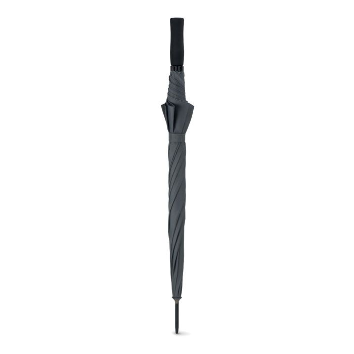 Зонт полуавтомат устойчивый к ветру с черным металлическим стержнем и черной пластиковой ручкой. Длина в сложенном виде 23 см.